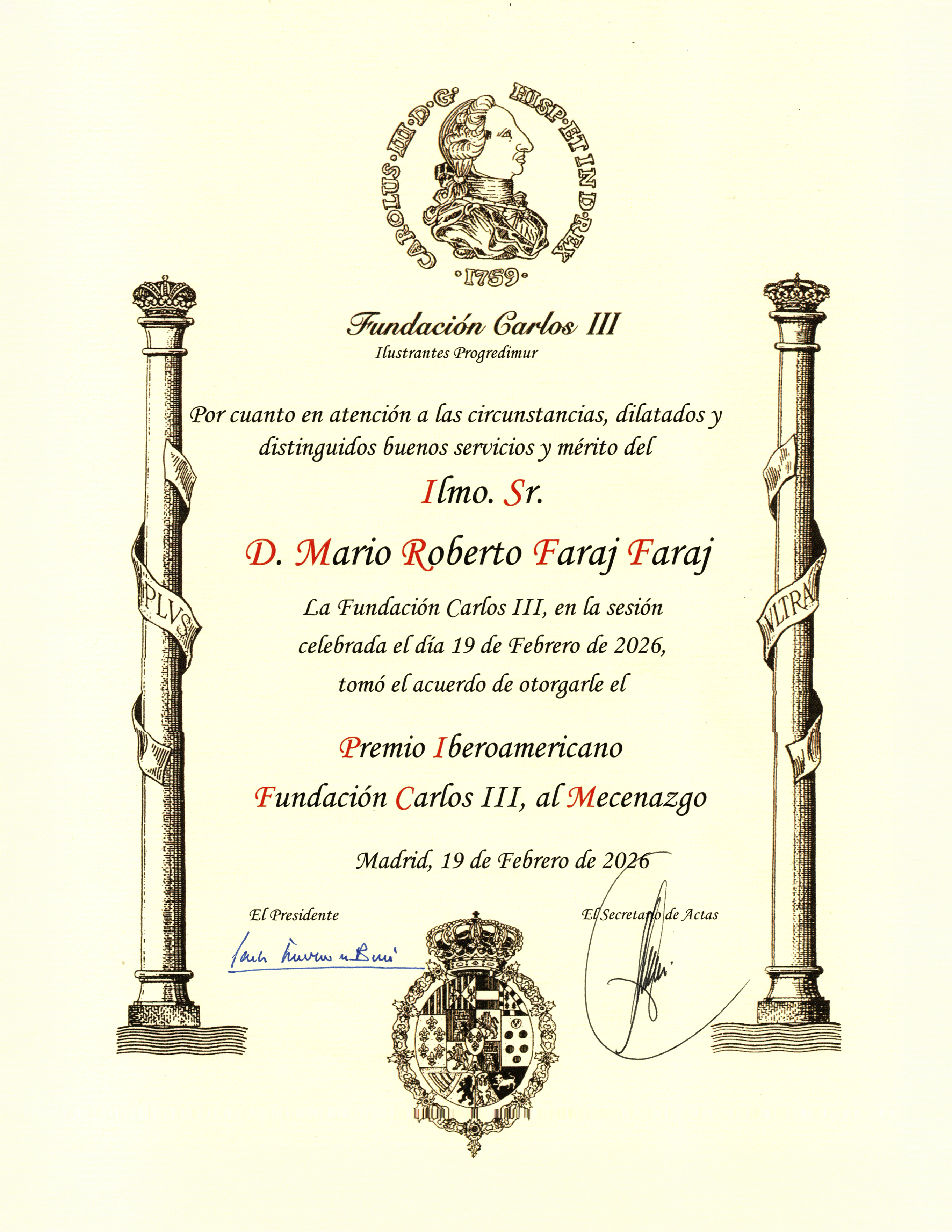 La Fundación Carlos III, a través de su presidente Carlos Escudero de Burón, hizo entrega del “Premio Iberoamericano FCIII de mecenazgo de esta institución” a Mario Roberto Faraj, presidente de la Fundación Diunsa.