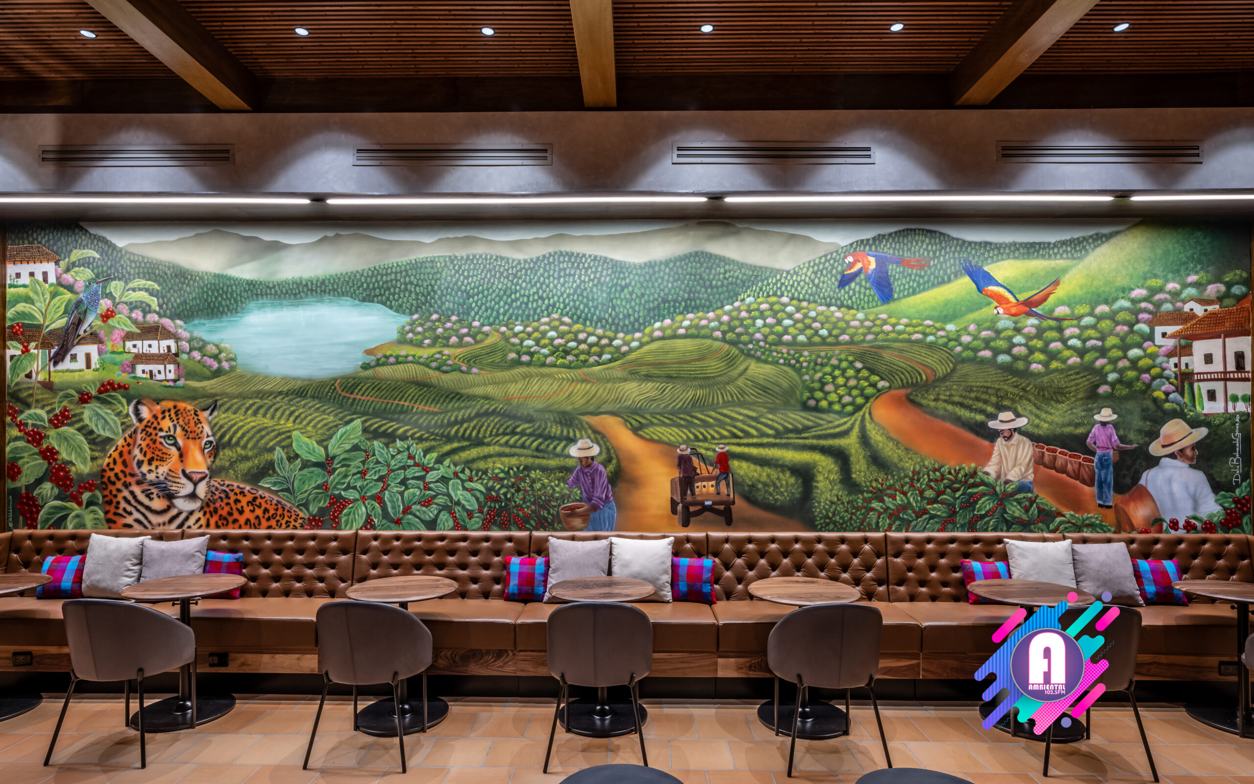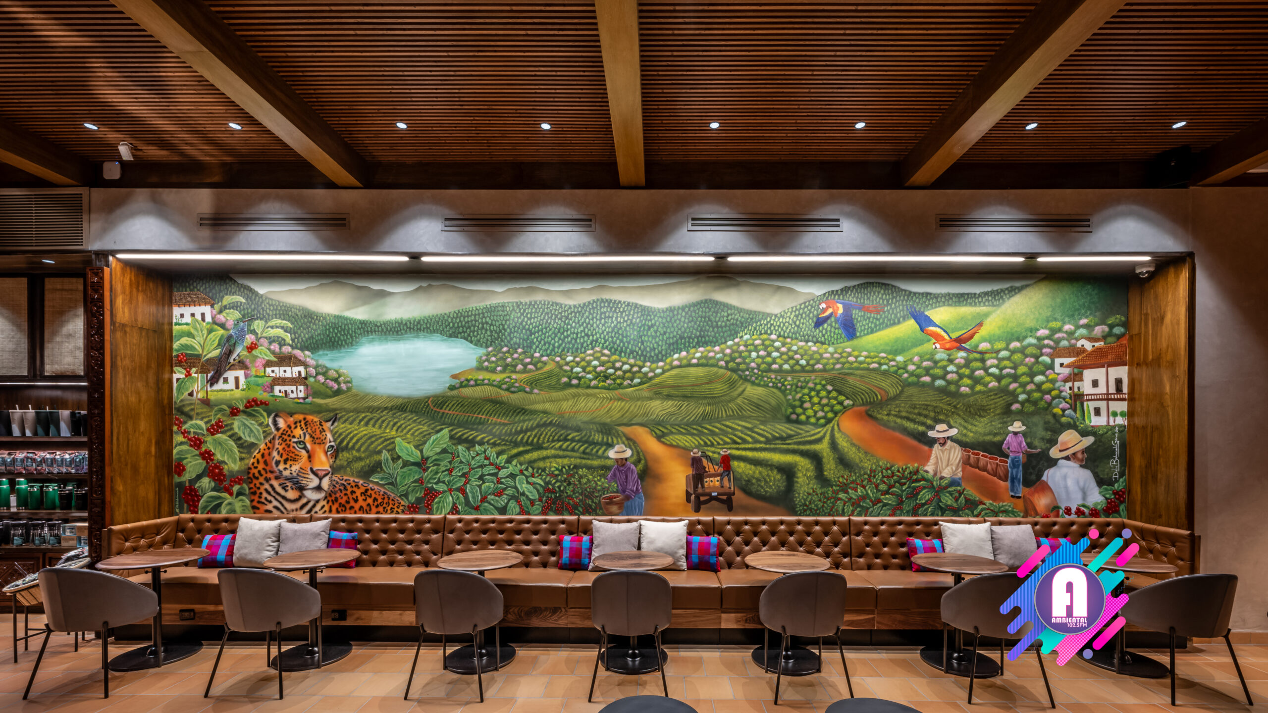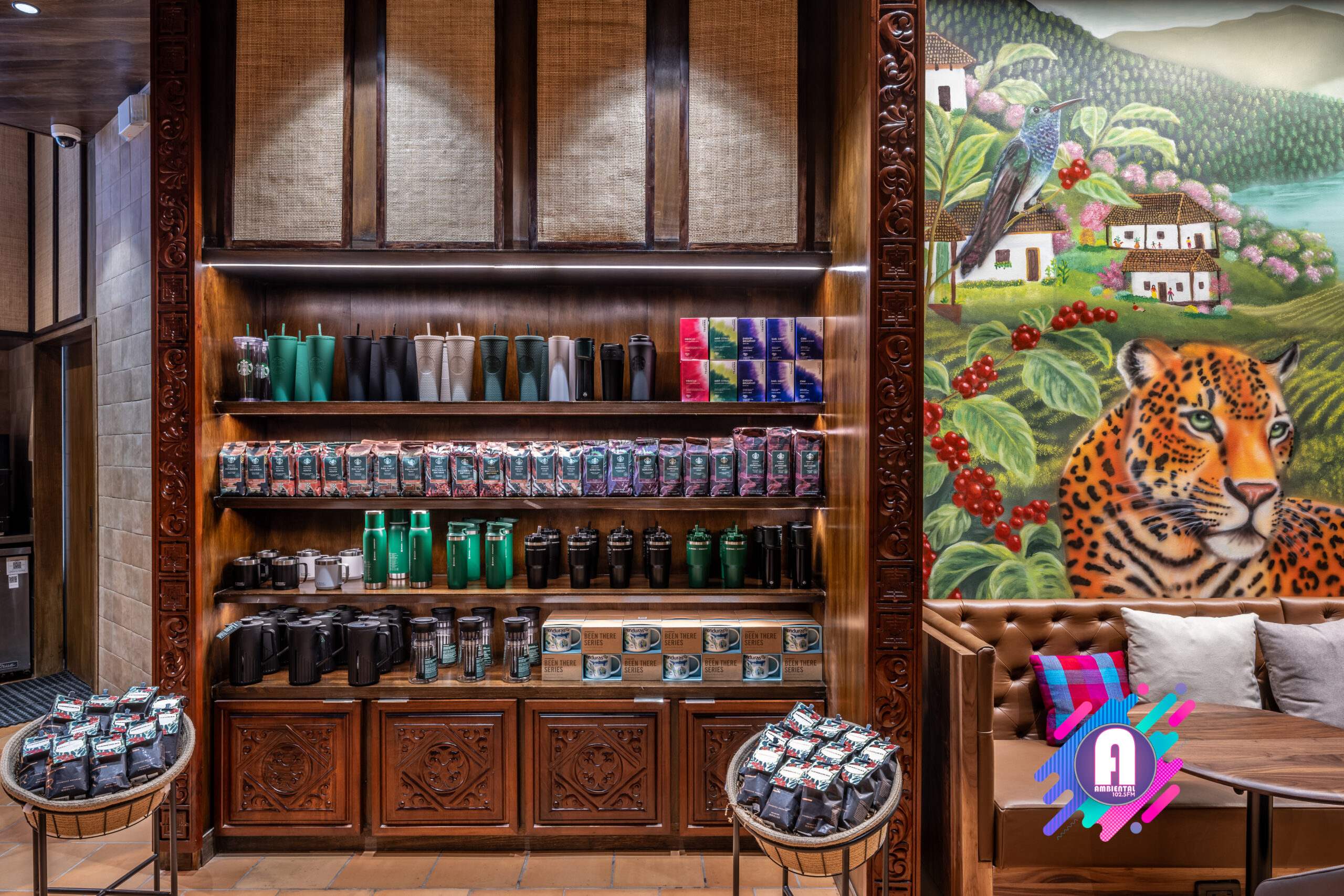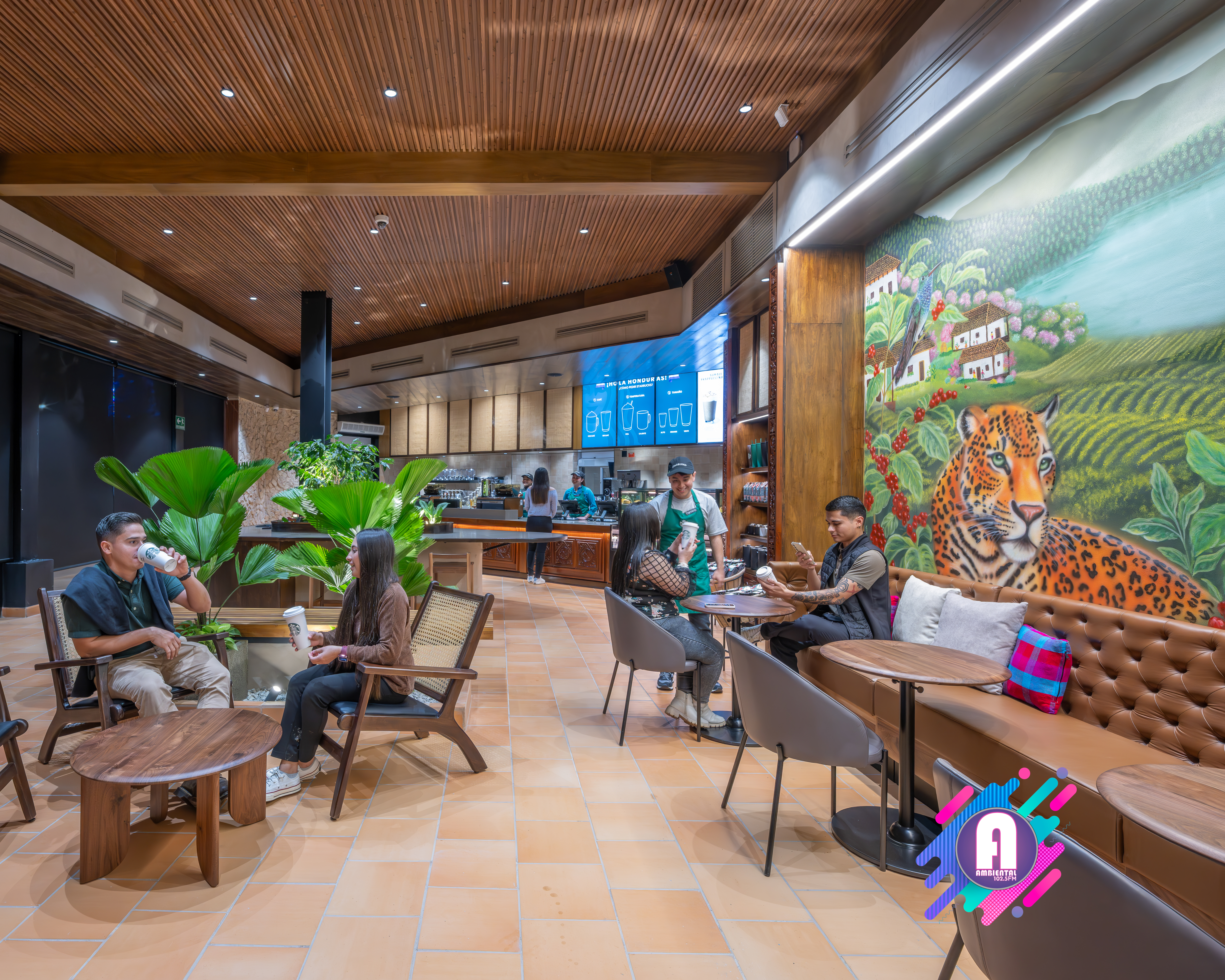 La tienda contará con obras de arte inspiradas en la cultura hondureña, celebrando la rica herencia y tradiciones del mercado. En el interior, un mural presenta un paisaje de una finca cafetera con seis agricultores que simbolizan las regiones productoras de café de Honduras: Copán, Opalaca, Montecillos, Comayagua, El Paraíso y Agalta, destacando la dedicación detrás del cultivo de este grano. Creado por la artista hondureña Dalia Balmaceda, el mural también celebra la fauna local, como el colibrí esmeralda y el jaguar. La pieza combina elementos de arte urbano con arte folclórico tradicional, utilizando texturas y detalles que reflejan la identidad cultural hondureña.
