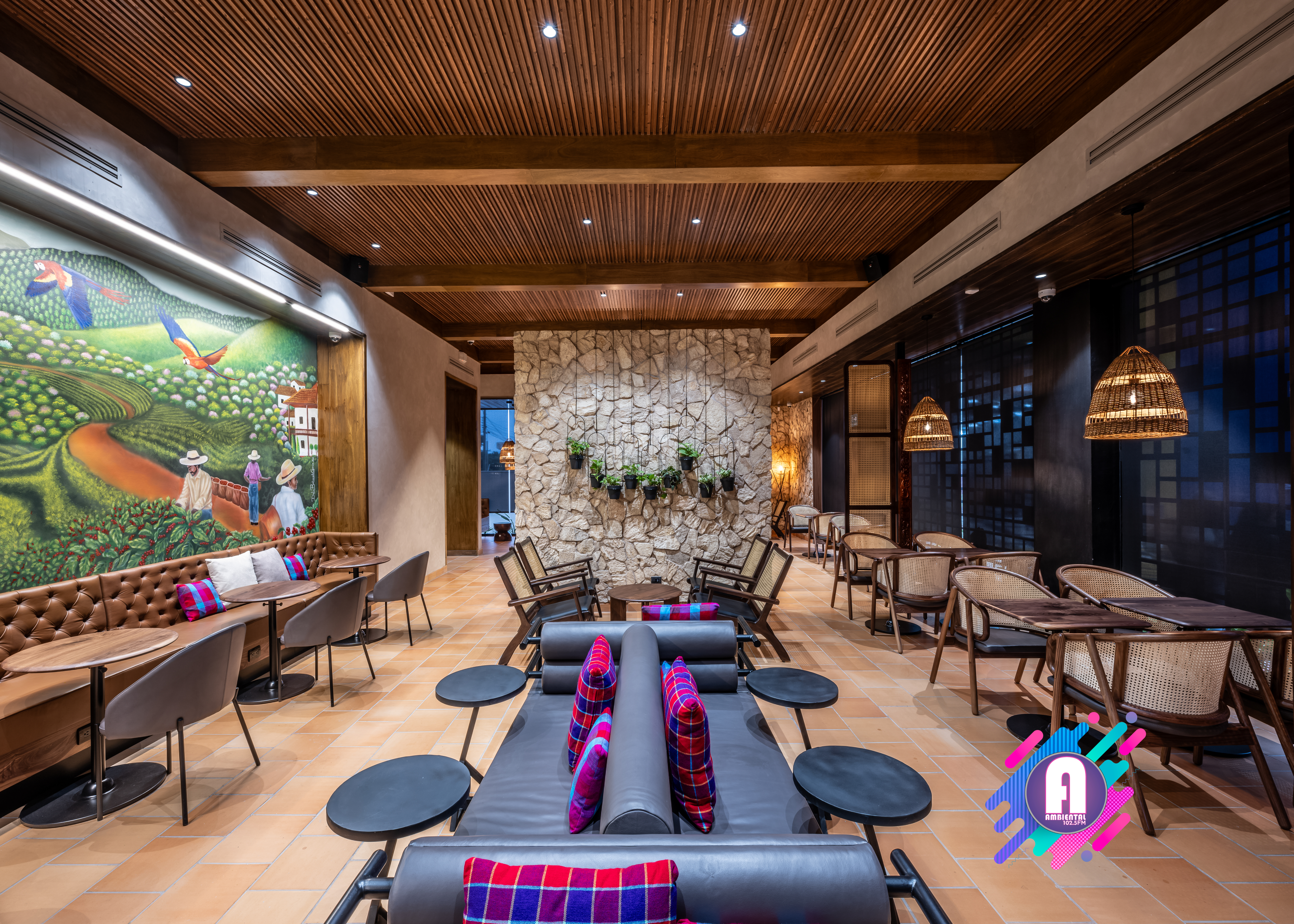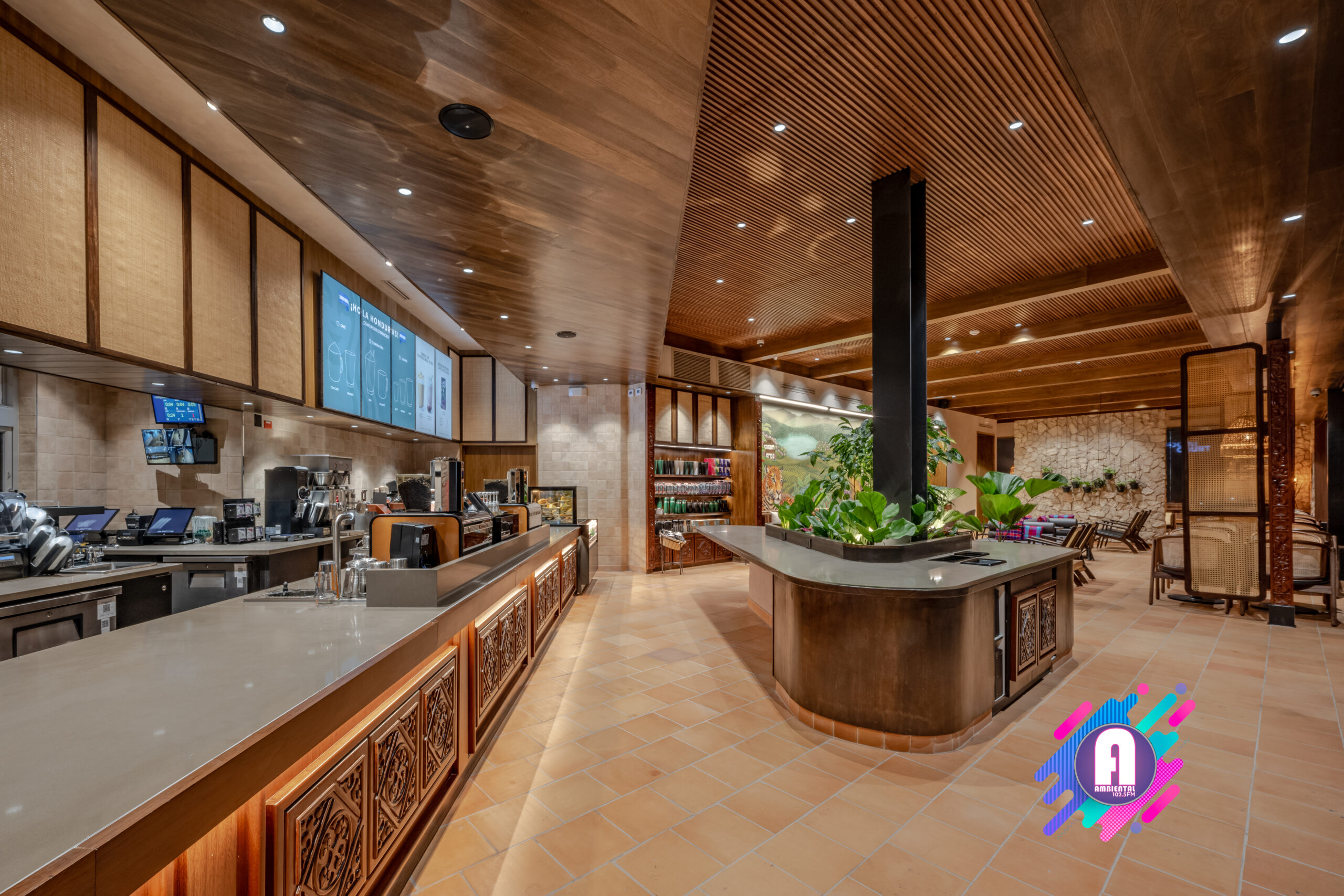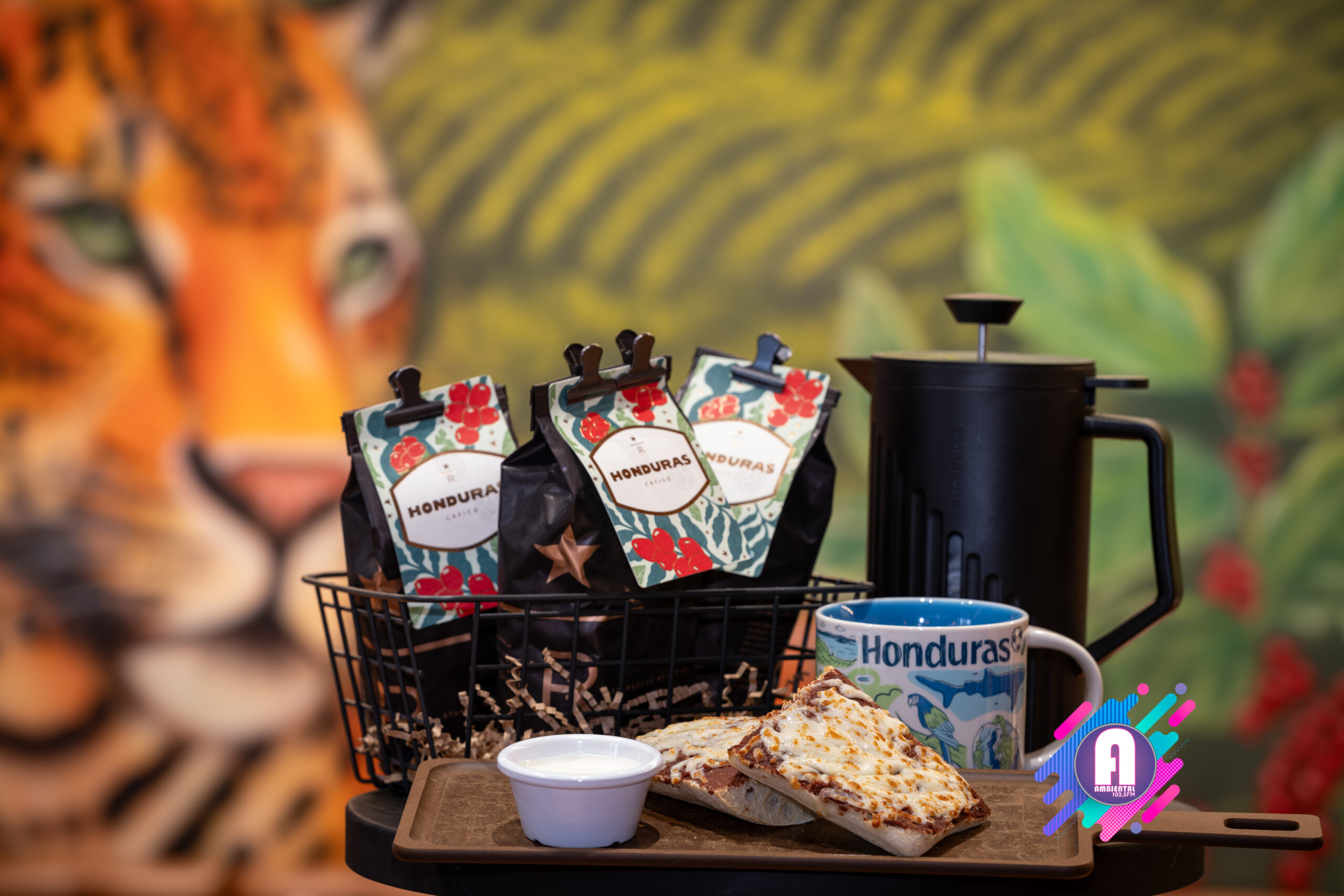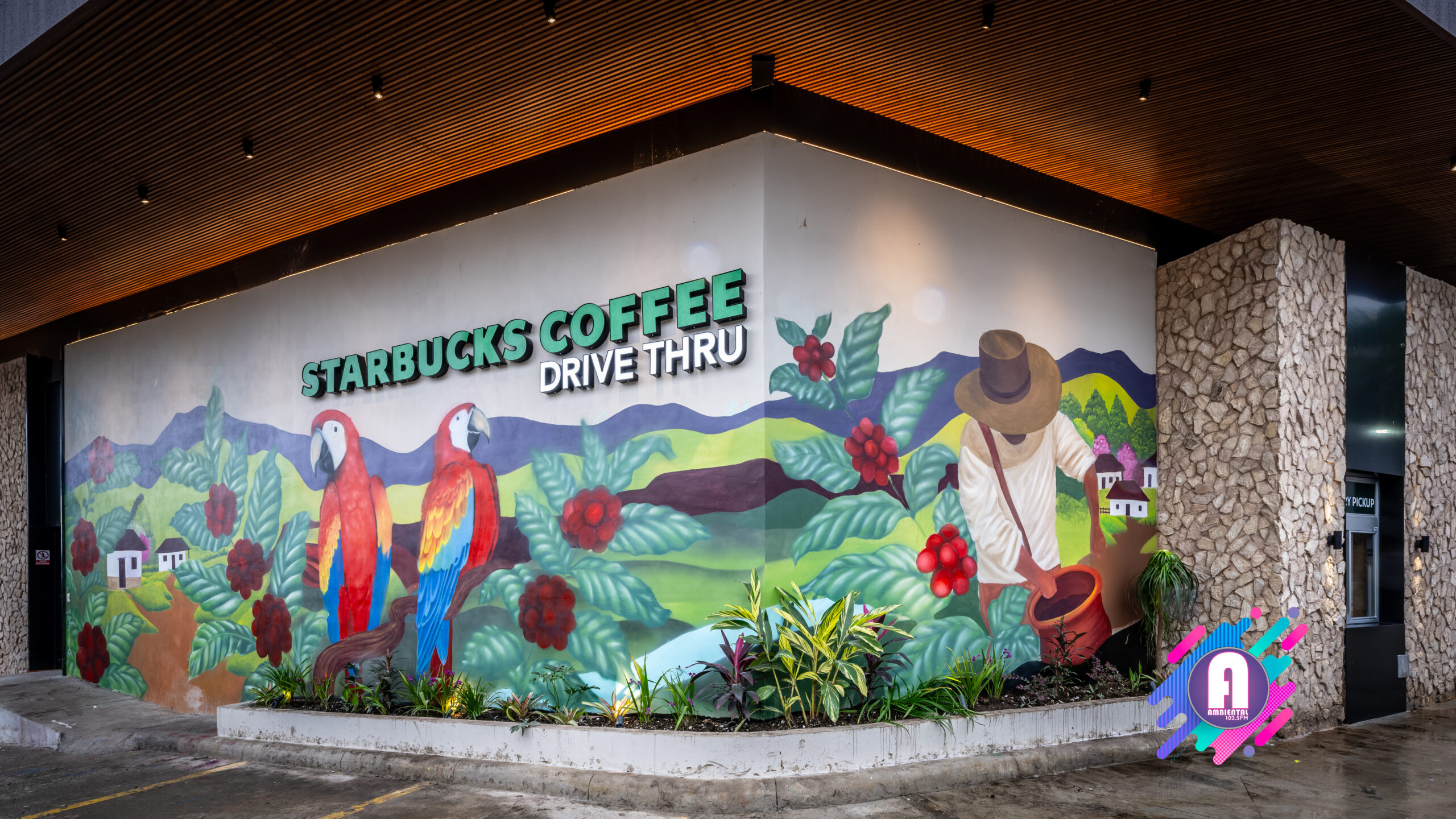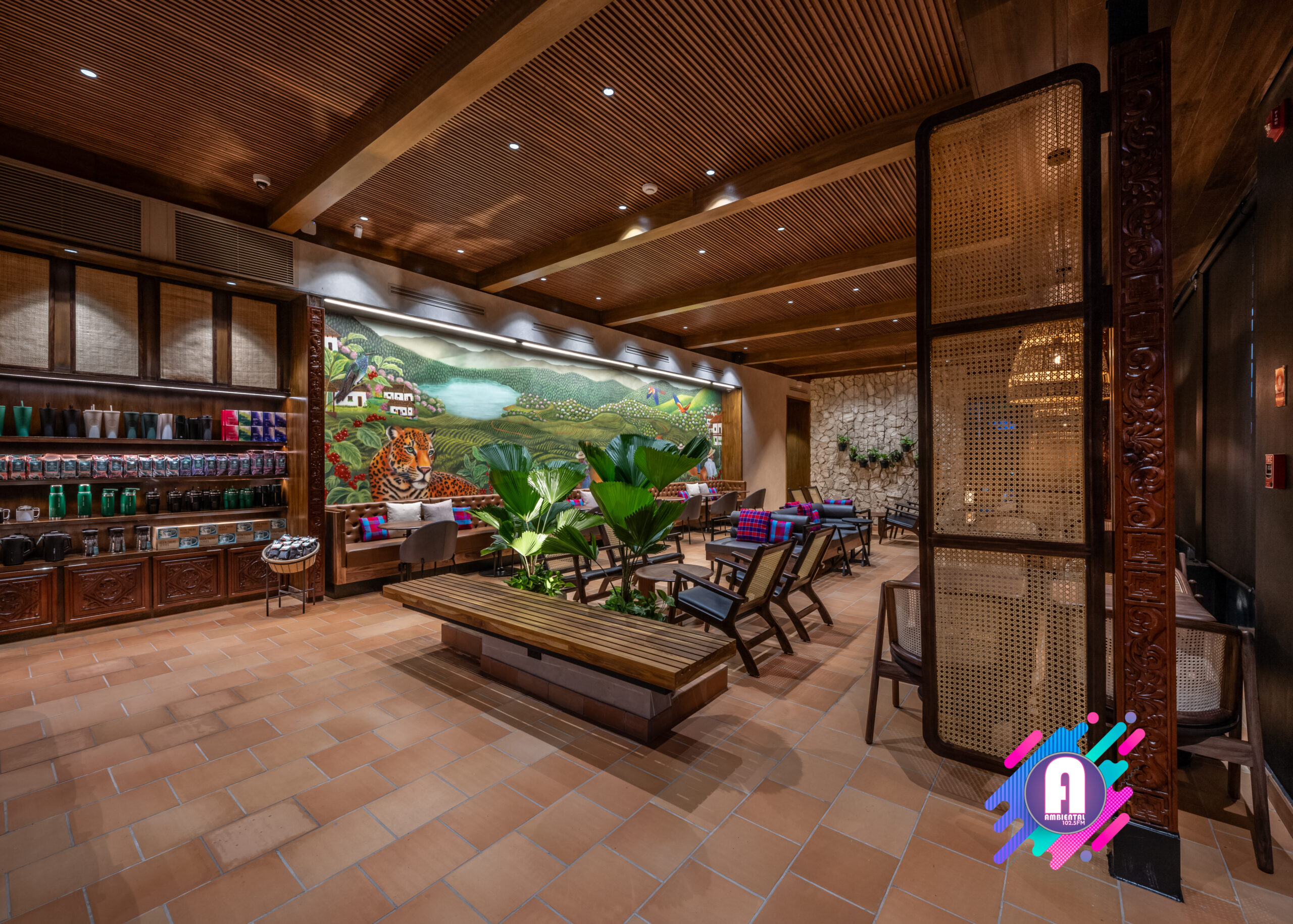 La tienda contará con obras de arte inspiradas en la cultura hondureña, celebrando la rica herencia y tradiciones del mercado. En el interior, un mural presenta un paisaje de una finca cafetera con seis agricultores que simbolizan las regiones productoras de café de Honduras: Copán, Opalaca, Montecillos, Comayagua, El Paraíso y Agalta, destacando la dedicación detrás del cultivo de este grano. Creado por la artista hondureña Dalia Balmaceda, el mural también celebra la fauna local, como el colibrí esmeralda y el jaguar. La pieza combina elementos de arte urbano con arte folclórico tradicional, utilizando texturas y detalles que reflejan la identidad cultural hondureña.