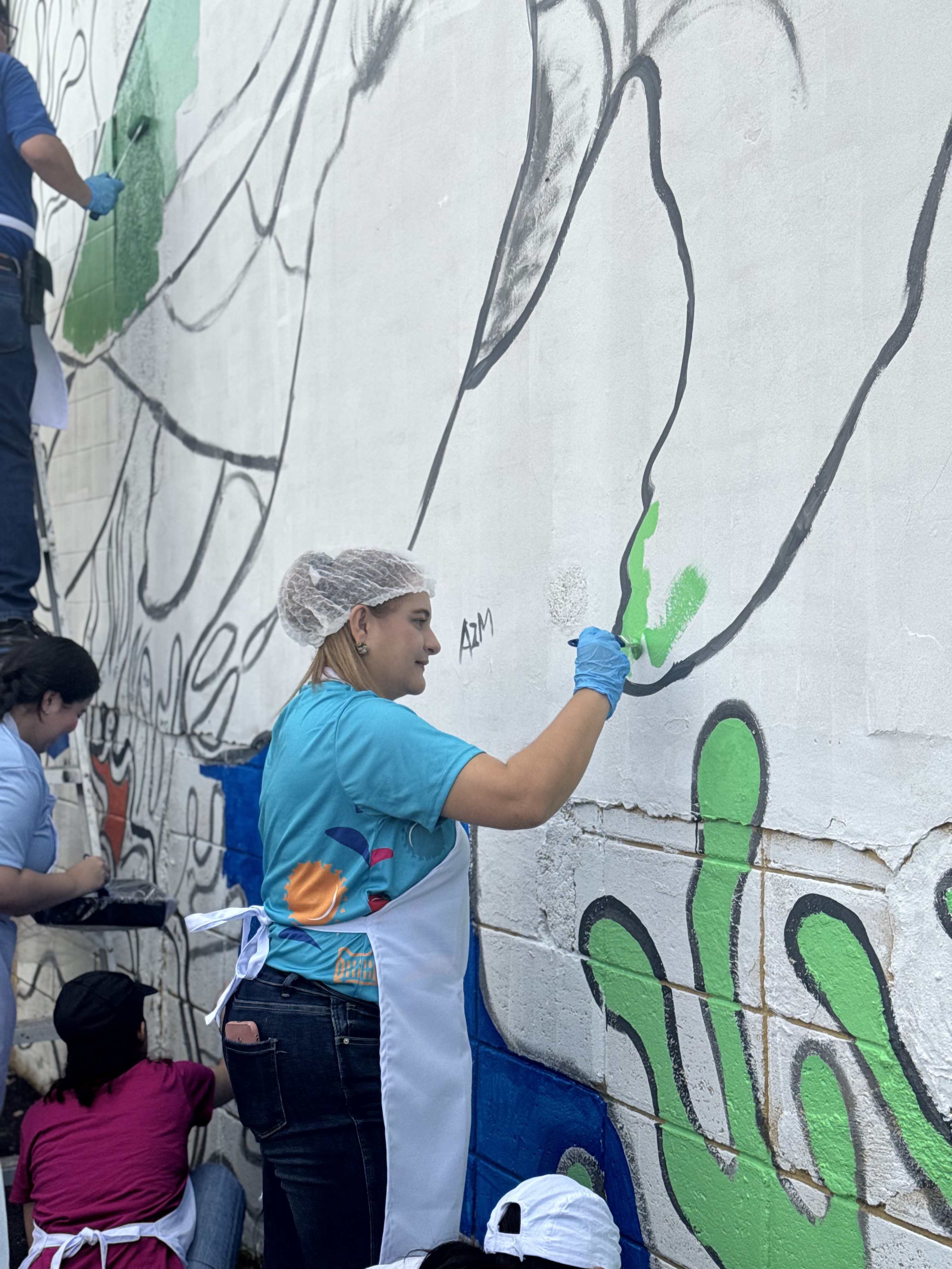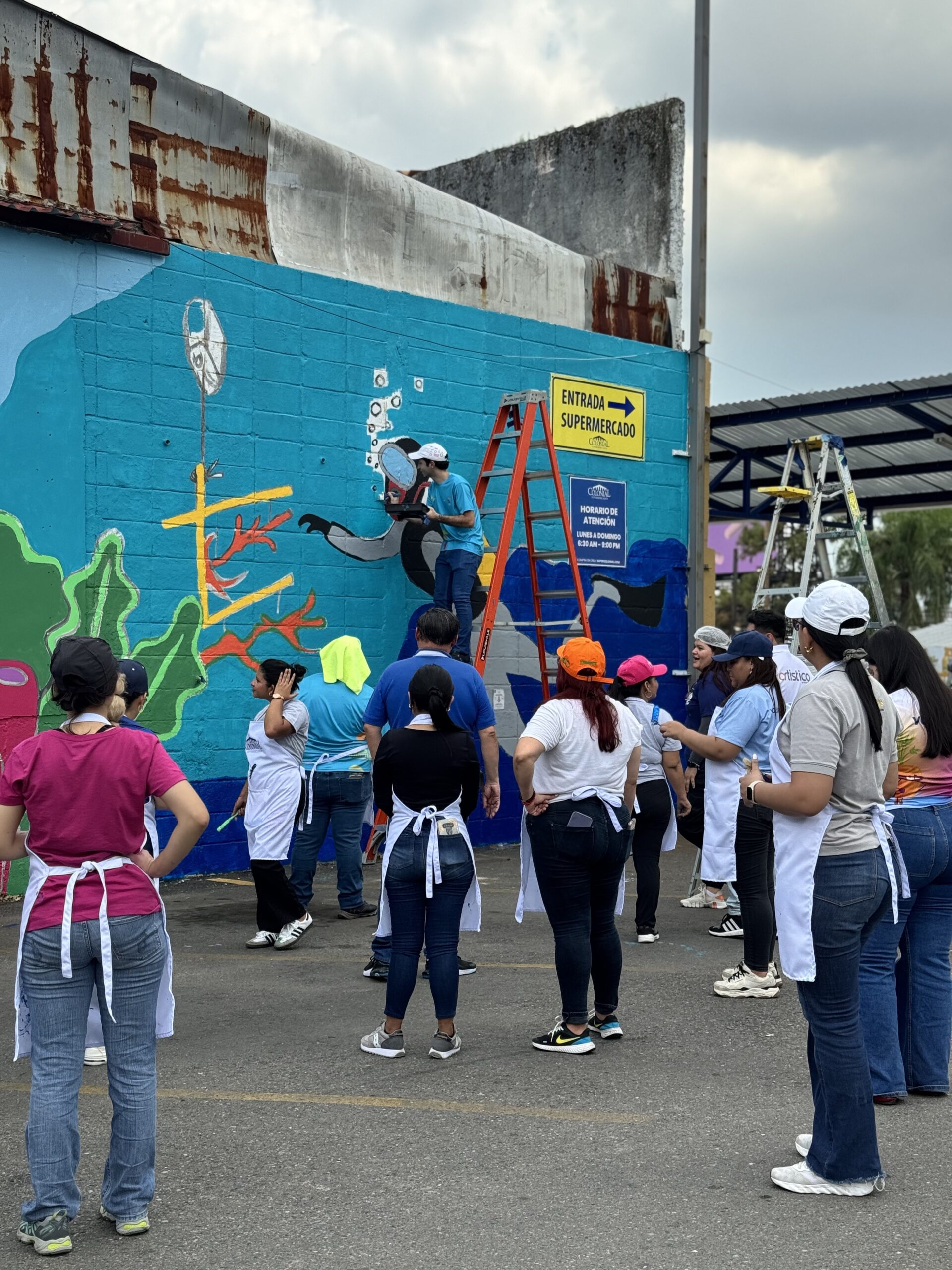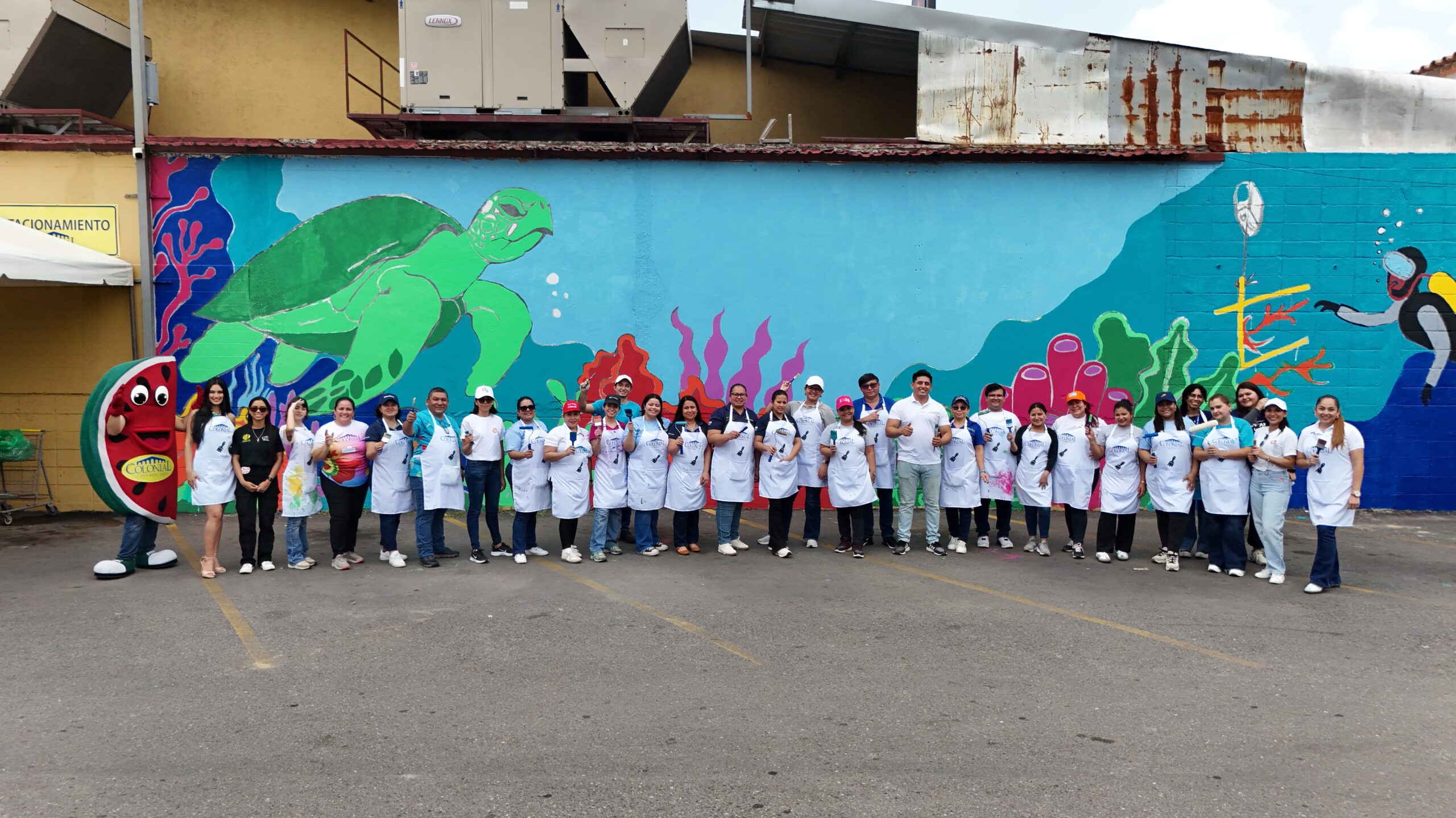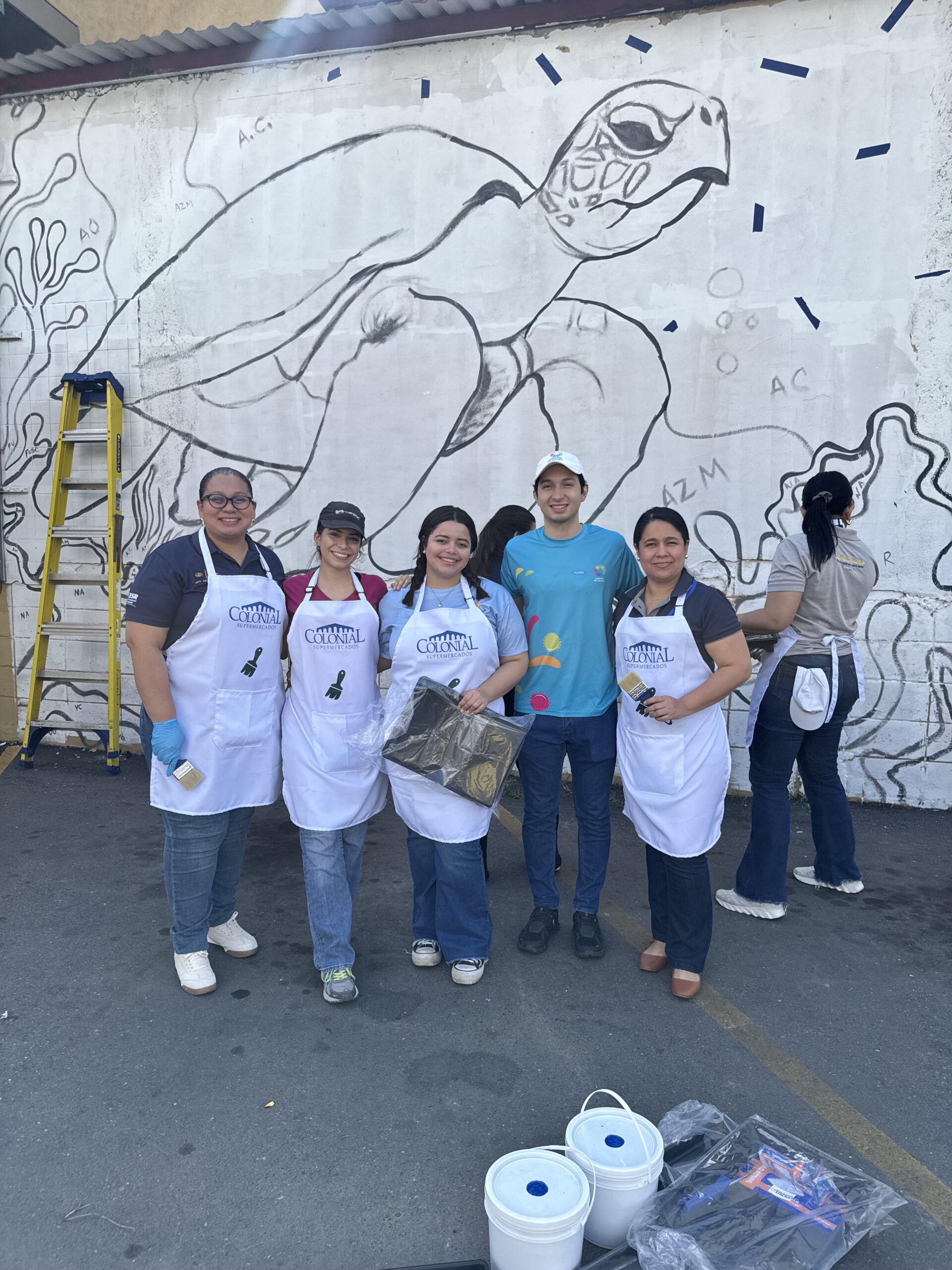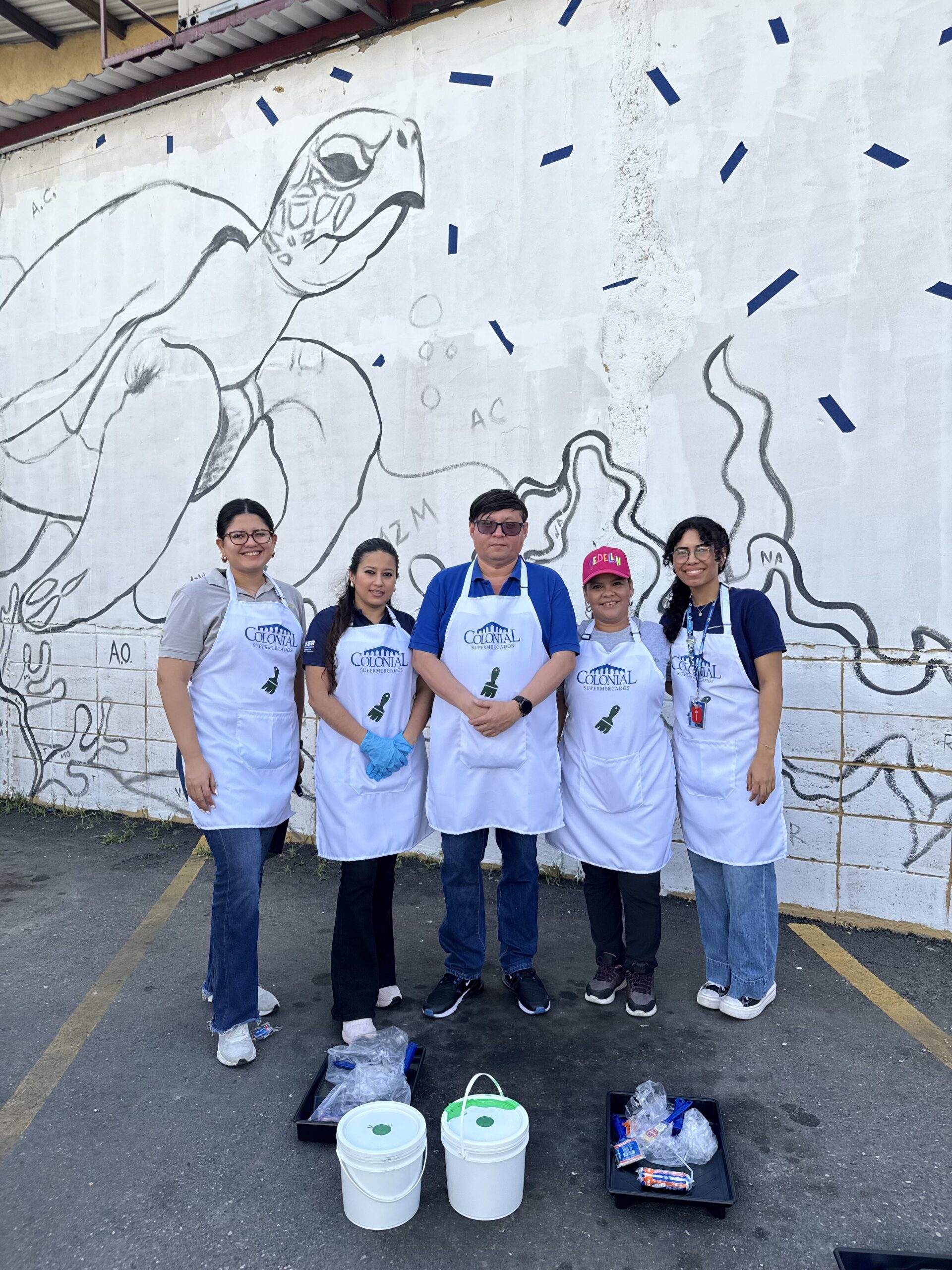 Luego, los participantes se trasladaron al estacionamiento de Supemercado sucursal #1 avenida circunvalación, donde se pintó un mural con temática ambiental, como símbolo del compromiso con la educación ambiental y el voluntariado. La jornada incluyó un coffee break de bienvenida, espacio de integración y un almuerzo con los participantes.