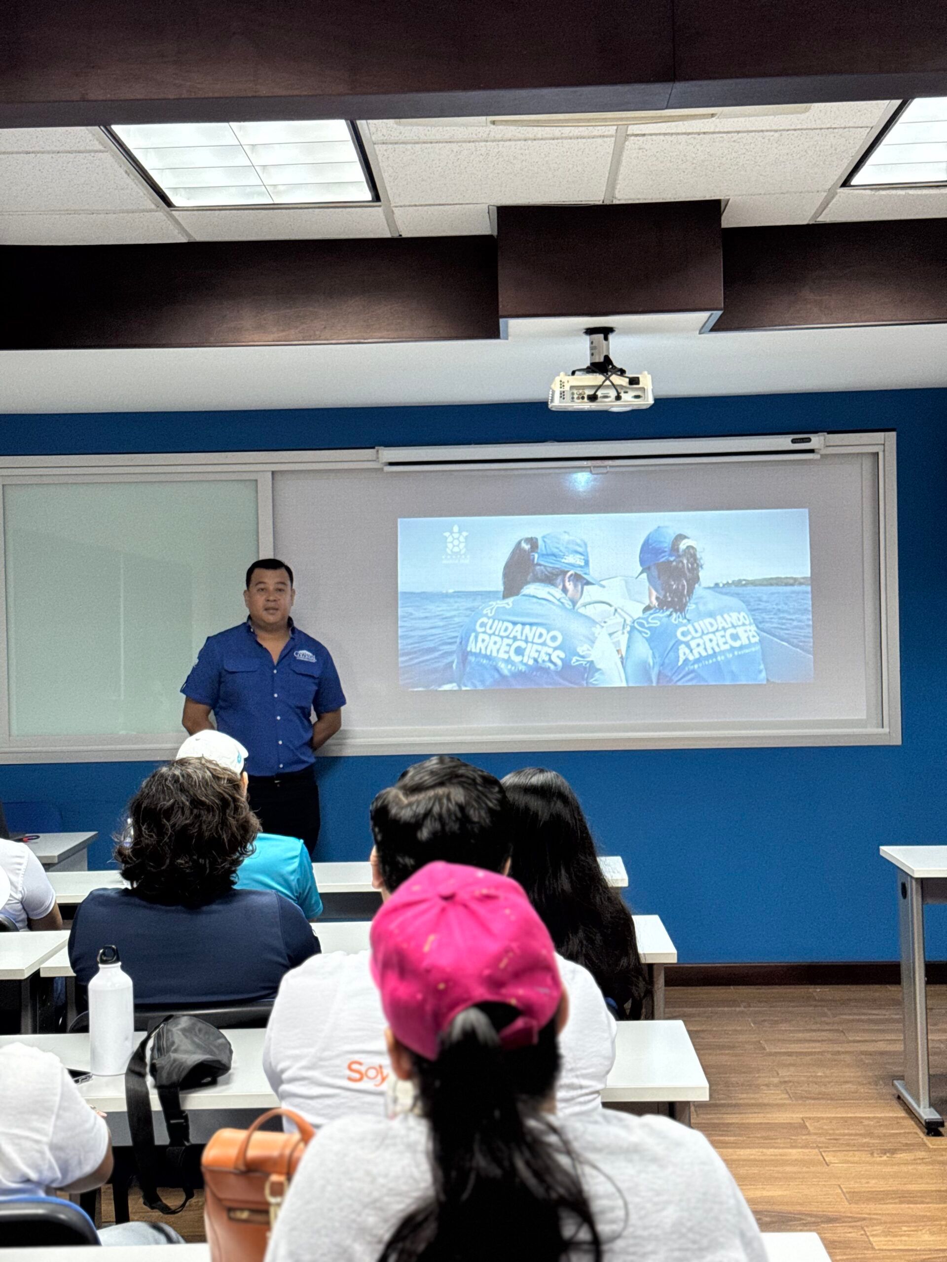 La jornada comenzó en la Universidad Privada de San Pedro Sula (USAP) con una presentación sobre la alianza entre Supermercados Colonial y Roatan Marine Park (RMP), destacando los proyectos de conservación marina que lidera esta organización y la importancia de la colaboración entre el sector privado y comunidades para proteger los ecosistemas marinos en Honduras.